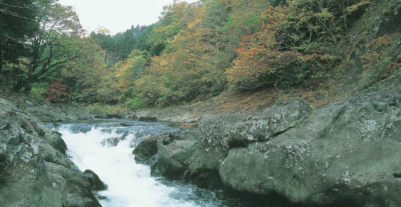 This Kawauchi River Valley shaped with shoals and deep pools looks different each season. Depending on the season, fresh green or deep red color the river's water surface creating a magnificent picture.