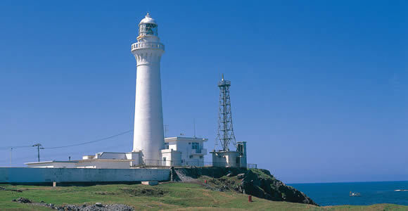 海角最前端聳立著白色的尻屋崎燈塔,前面是「本州際最涯地(本州盡頭之意)」的石碑與鳴海要吉的文字碑「諦めの旅ではあった 磯の先の白い灯台に 日がさしていた(絕望之旅陽光灑落於岩岸上的白色燈塔)」。